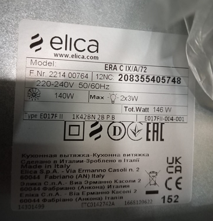Вытяжка выполнена в металлическом корпусе и при встраивании в мебельный шкаф становится практически незаметной. Жировой фильтр устраняет запахи и частицы жира, а при необходимости очистки без труда моется. Две светодиодные лампы мощностью по 3 Вт создают яркое освещение, что делает эксплуатацию вытяжки Elica Era C IX/A/72 комфортной в любое время суток.